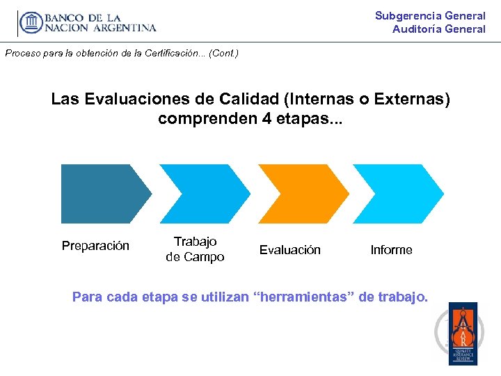 Subgerencia General Auditoría General Proceso para la obtención de la Certificación. . . (Cont. ) Las Evaluaciones de Calidad (Internas o Externas) comprenden 4 etapas. . . Preparación Trabajo de Campo Evaluación Informe Para cada etapa se utilizan “herramientas” de trabajo.