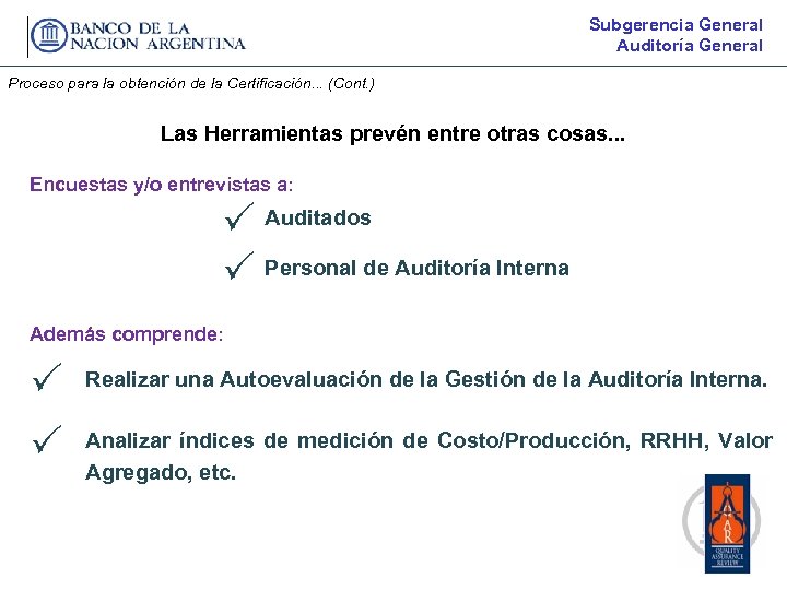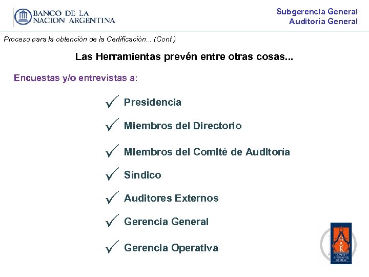Subgerencia General Auditoría General Proceso para la obtención de la Certificación. . . (Cont. ) Las Herramientas prevén entre otras cosas. . . Encuestas y/o entrevistas a: P Presidencia P Miembros del Directorio P Miembros del Comité de Auditoría P Síndico P Auditores Externos P Gerencia General P Gerencia Operativa