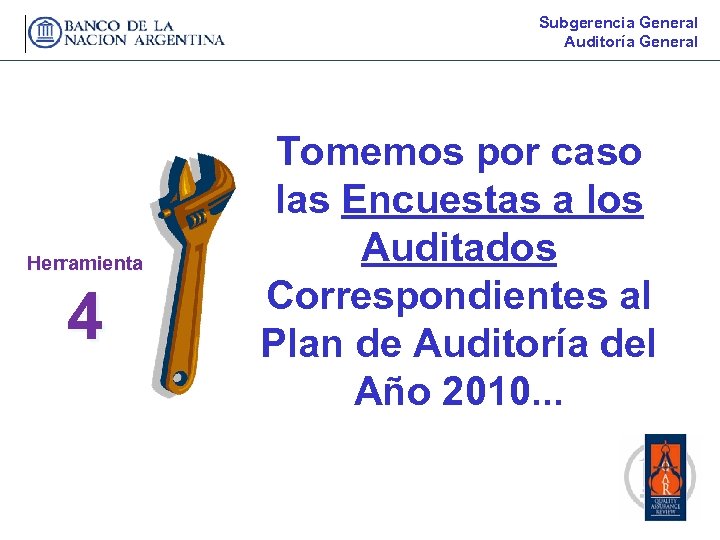 Subgerencia General Auditoría General Herramienta 4 Tomemos por caso las Encuestas a los Auditados Correspondientes al Plan de Auditoría del Año 2010. . .