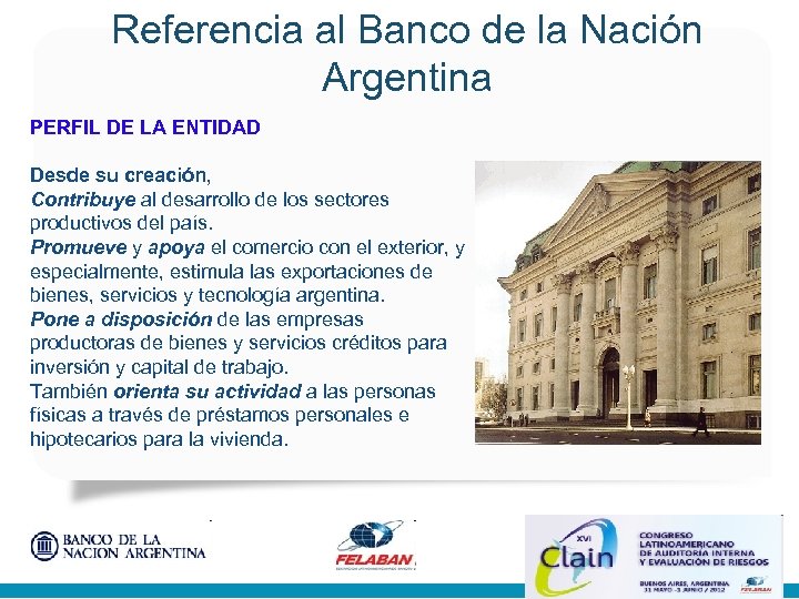 Referencia al Banco de la Nación Argentina PERFIL DE LA ENTIDAD Desde su creación, Contribuye al desarrollo de los sectores productivos del país. Promueve y apoya el comercio con el exterior, y especialmente, estimula las exportaciones de bienes, servicios y tecnología argentina. Pone a disposición de las empresas productoras de bienes y servicios créditos para inversión y capital de trabajo. También orienta su actividad a las personas físicas a través de préstamos personales e hipotecarios para la vivienda.