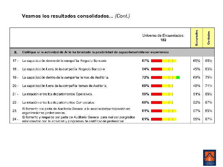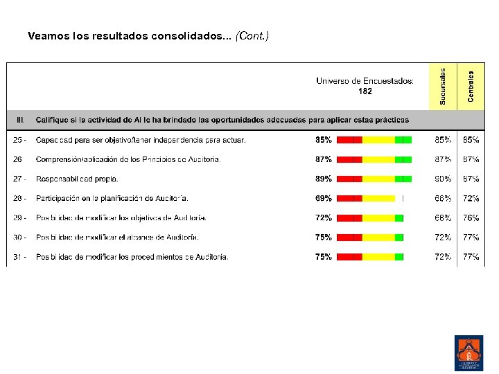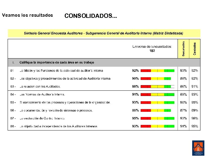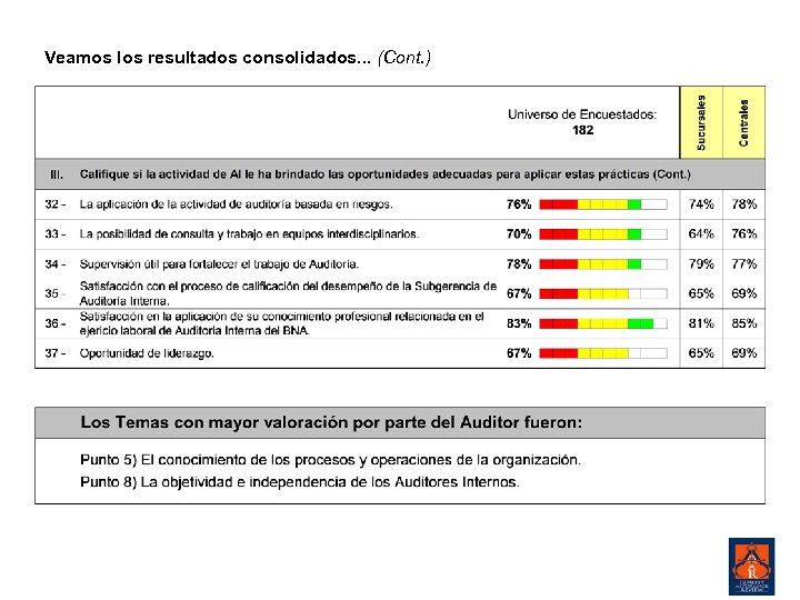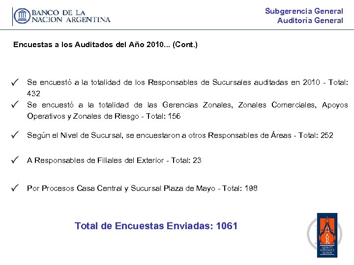 Subgerencia General Auditoría General Encuestas a los Auditados del Año 2010. . . (Cont. ) P P Se encuestó a la totalidad de los Responsables de Sucursales auditadas en 2010 - Total: 432 Se encuestó a la totalidad de las Gerencias Zonales, Zonales Comerciales, Apoyos Operativos y Zonales de Riesgo - Total: 156 P Según el Nivel de Sucursal, se encuestaron a otros Responsables de Áreas - Total: 252 P A Responsables de Filiales del Exterior - Total: 23 P Por Procesos Casa Central y Sucursal Plaza de Mayo - Total: 198 Total de Encuestas Enviadas: 1061