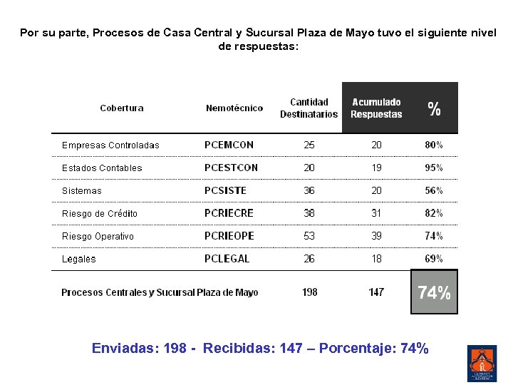Por su parte, Procesos de Casa Central y Sucursal Plaza de Mayo tuvo el siguiente nivel de respuestas: Enviadas: 198 - Recibidas: 147 – Porcentaje: 74%