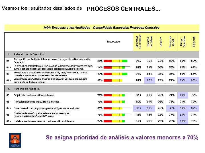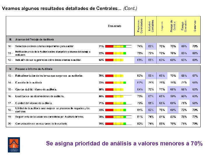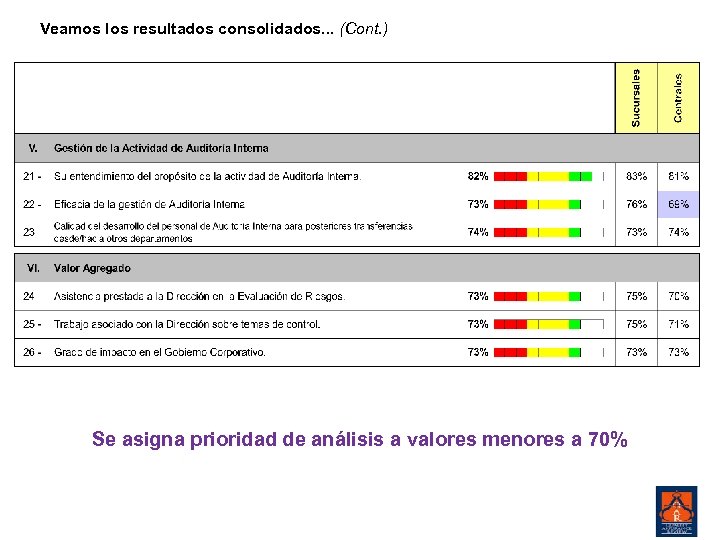 Veamos los resultados consolidados. . . (Cont. ) Se asigna prioridad de análisis a valores menores a 70%