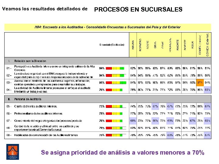Veamos los resultados detallados de Sucursales. . . (Cont. ) Se asigna prioridad de análisis a valores menores a 70%