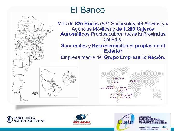 El Banco Más de 670 Bocas (621 Sucursales, 46 Anexos y 4 Agencias Móviles) y de 1. 200 Cajeros Automáticos Propios cubren todas la Provincias del País. Sucursales y Representaciones propias en el Exterior Empresa madre del Grupo Empresario Nación.