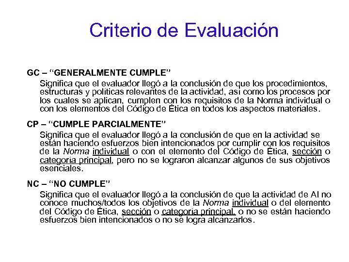 Criterio de Evaluación GC – “GENERALMENTE CUMPLE” Significa que el evaluador llegó a la conclusión de que los procedimientos, estructuras y políticas relevantes de la actividad, así como los procesos por los cuales se aplican, cumplen con los requisitos de la Norma individual o con los elementos del Código de Ética en todos los aspectos materiales. CP – “CUMPLE PARCIALMENTE” Significa que el evaluador llegó a la conclusión de que en la actividad se están haciendo esfuerzos bien intencionados por cumplir con los requisitos de la Norma individual o con el elemento del Código de Ética, sección o categoría principal, pero no se lograron alcanzar algunos de sus objetivos esenciales. NC – “NO CUMPLE” Significa que el evaluador llegó a la conclusión de que la actividad de AI no conoce muchos/todos los objetivos de la Norma individual o del elemento del Código de Ética, sección o categoría principal, o no se están haciendo esfuerzos bien intencionados o no se logra alcanzarlos.