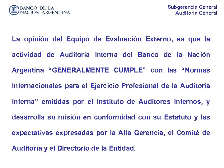 Subgerencia General Auditoría General La opinión del Equipo de Evaluación Externo, es que la actividad de Auditoría Interna del Banco de la Nación Argentina “GENERALMENTE CUMPLE” con las “Normas CUMPLE” Internacionales para el Ejercicio Profesional de la Auditoría Interna” emitidas por el Instituto de Auditores Internos, y desarrolla su misión en conformidad con su Estatuto y las expectativas expresadas por la Alta Gerencia, el Comité de Auditoría y el Directorio de la Entidad.