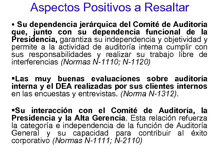 Aspectos Positivos a Resaltar § Su dependencia jerárquica del Comité de Auditoría que, junto con su dependencia funcional de la Presidencia, garantiza su independencia y objetividad y permite a la actividad de auditoría interna cumplir con sus responsabilidades y realizar su trabajo libre de interferencias (Normas N-1110; N-1120) §Las muy buenas evaluaciones sobre auditoría interna y el DEA realizadas por sus clientes internos en las encuestas y entrevistas. (Norma N-1312). §Su interacción con el Comité de Auditoría, la Presidencia y la Alta Gerencia. Esta relación refuerza la categoría e independencia de la función de Auditoría General y su capacidad para contribuir al éxito corporativo (Normas N-1111; N-2110)