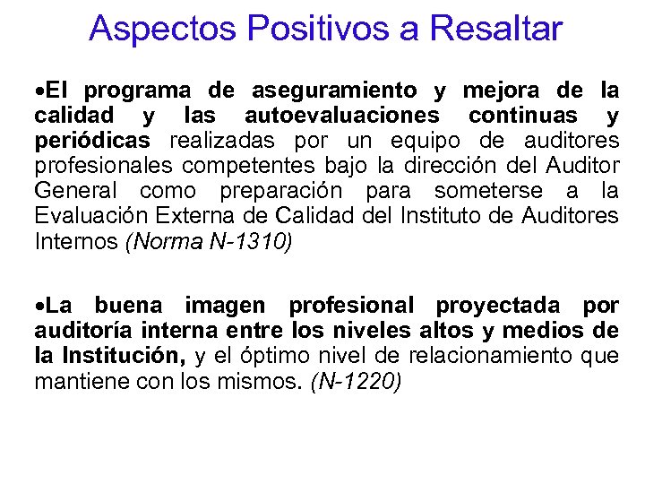 Aspectos Positivos a Resaltar ·El programa de aseguramiento y mejora de la calidad y las autoevaluaciones continuas y periódicas realizadas por un equipo de auditores profesionales competentes bajo la dirección del Auditor General como preparación para someterse a la Evaluación Externa de Calidad del Instituto de Auditores Internos (Norma N-1310) ·La buena imagen profesional proyectada por auditoría interna entre los niveles altos y medios de la Institución, y el óptimo nivel de relacionamiento que mantiene con los mismos. (N-1220)