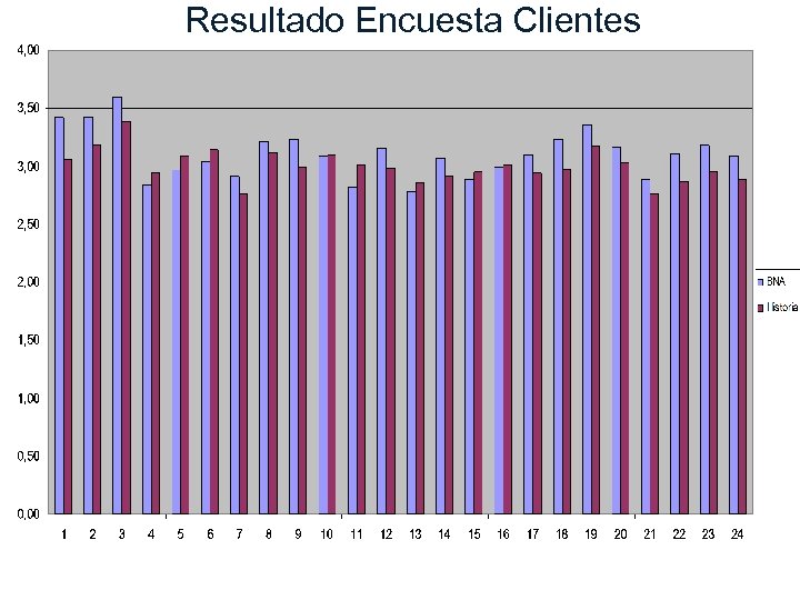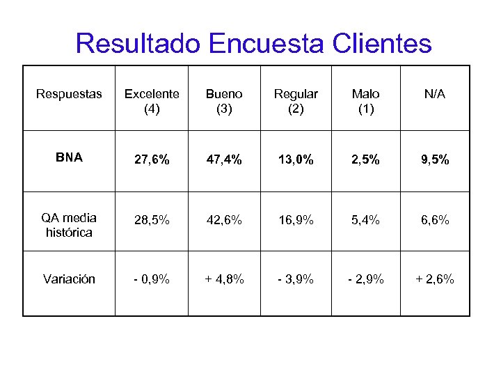 Resultado Encuesta Clientes Respuestas Excelente (4) Bueno (3) Regular (2) Malo (1) N/A BNA 27, 6% 47, 4% 13, 0% 2, 5% 9, 5% QA media histórica 28, 5% 42, 6% 16, 9% 5, 4% 6, 6% Variación - 0, 9% + 4, 8% - 3, 9% - 2, 9% + 2, 6%