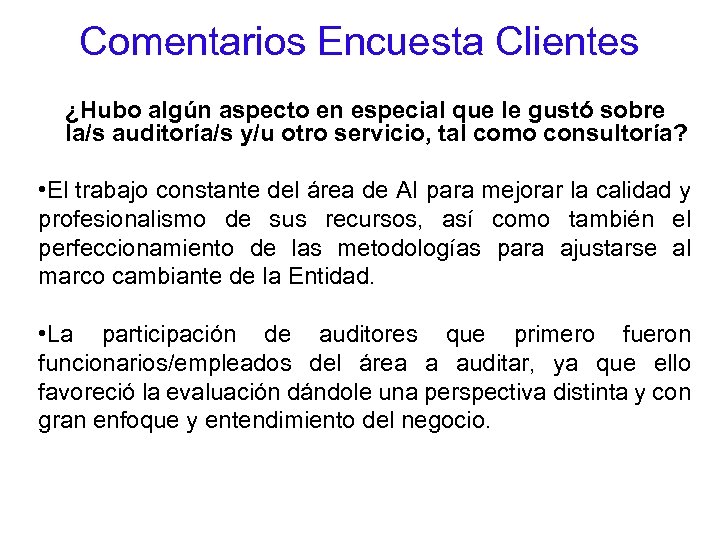 Comentarios Encuesta Clientes ¿Hubo algún aspecto en especial que le gustó sobre la/s auditoría/s y/u otro servicio, tal como consultoría? • El trabajo constante del área de AI para mejorar la calidad y profesionalismo de sus recursos, así como también el perfeccionamiento de las metodologías para ajustarse al marco cambiante de la Entidad. • La participación de auditores que primero fueron funcionarios/empleados del área a auditar, ya que ello favoreció la evaluación dándole una perspectiva distinta y con gran enfoque y entendimiento del negocio.