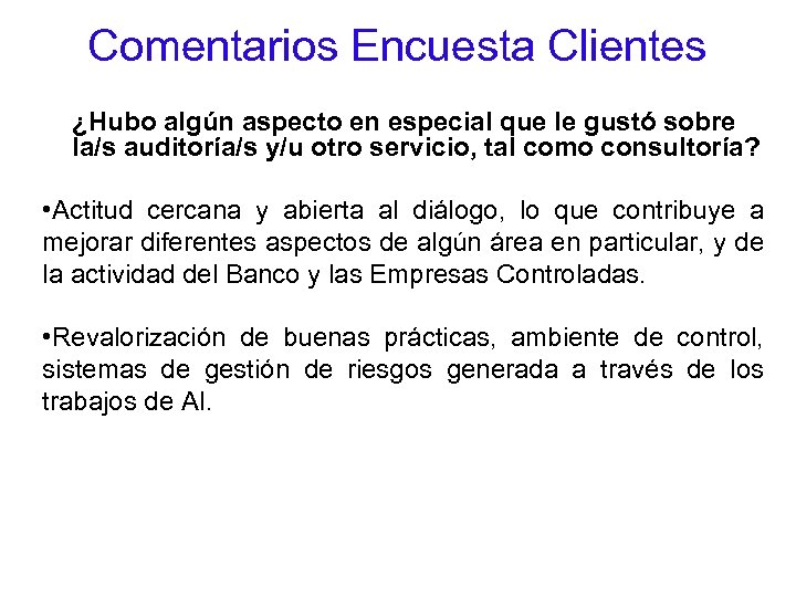 Comentarios Encuesta Clientes ¿Hubo algún aspecto en especial que le gustó sobre la/s auditoría/s y/u otro servicio, tal como consultoría? • Actitud cercana y abierta al diálogo, lo que contribuye a mejorar diferentes aspectos de algún área en particular, y de la actividad del Banco y las Empresas Controladas. • Revalorización de buenas prácticas, ambiente de control, sistemas de gestión de riesgos generada a través de los trabajos de AI.