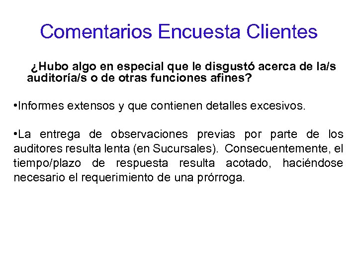 Comentarios Encuesta Clientes ¿Hubo algo en especial que le disgustó acerca de la/s auditoría/s o de otras funciones afines? • Informes extensos y que contienen detalles excesivos. • La entrega de observaciones previas por parte de los auditores resulta lenta (en Sucursales). Consecuentemente, el tiempo/plazo de respuesta resulta acotado, haciéndose necesario el requerimiento de una prórroga.