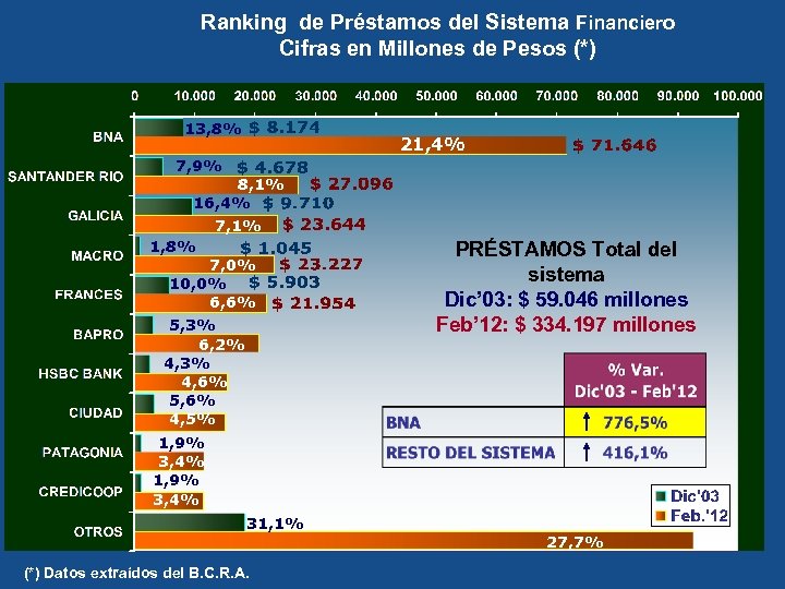 Ranking de Préstamos del Sistema Financiero Cifras en Millones de Pesos (*) 13, 8% 21, 4% 7, 9% 8, 1% 16, 4% 7, 1% 1, 8% 7, 0% 10, 0% 6, 6% 5, 3% 6, 2% 4, 3% 4, 6% 5, 6% 4, 5% PRÉSTAMOS Total del sistema Dic’ 03: $ 59. 046 millones Feb’ 12: $ 334. 197 millones 1, 9% 3, 4% 31, 1% 27, 7% (*) Datos extraídos del B. C. R. A.
