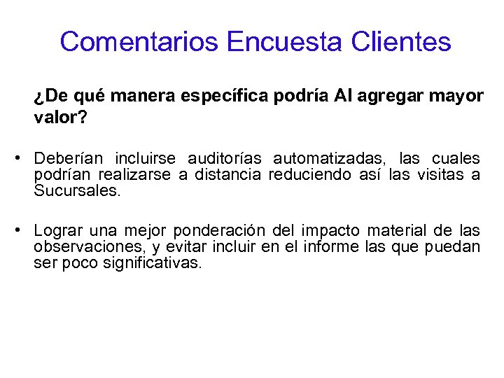 Comentarios Encuesta Clientes ¿De qué manera específica podría AI agregar mayor valor? • Deberían incluirse auditorías automatizadas, las cuales podrían realizarse a distancia reduciendo así las visitas a Sucursales. • Lograr una mejor ponderación del impacto material de las observaciones, y evitar incluir en el informe las que puedan ser poco significativas.