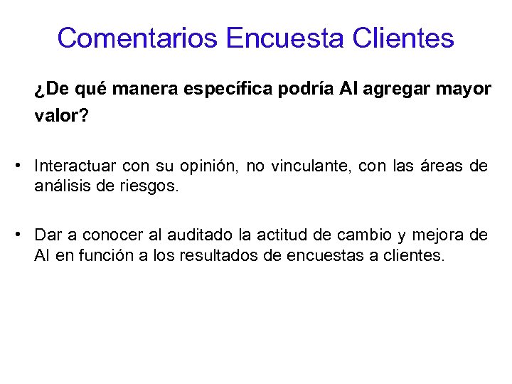 Comentarios Encuesta Clientes ¿De qué manera específica podría AI agregar mayor valor? • Interactuar con su opinión, no vinculante, con las áreas de análisis de riesgos. • Dar a conocer al auditado la actitud de cambio y mejora de AI en función a los resultados de encuestas a clientes.