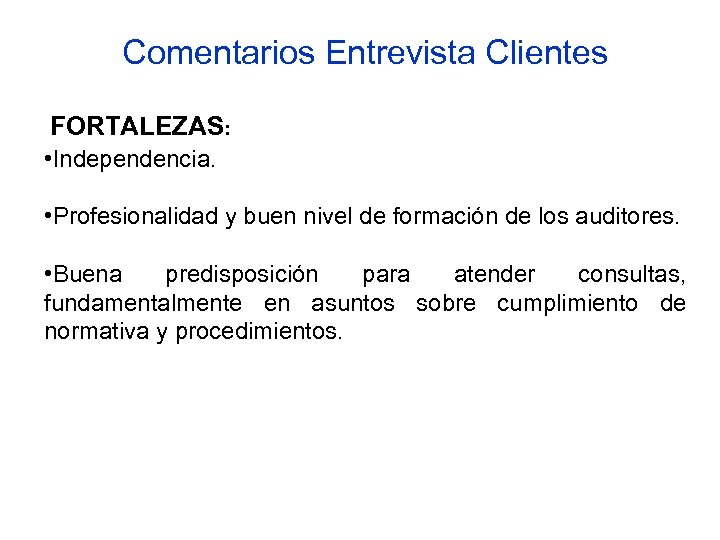 Comentarios Entrevista Clientes FORTALEZAS: • Independencia. • Profesionalidad y buen nivel de formación de los auditores. • Buena predisposición para atender consultas, fundamentalmente en asuntos sobre cumplimiento de normativa y procedimientos.