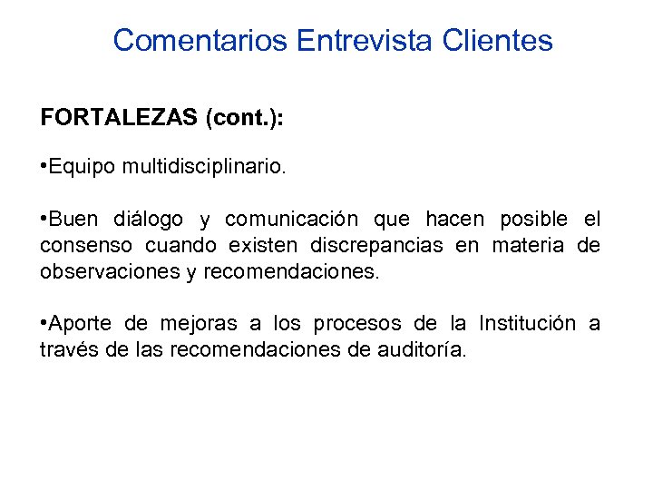 Comentarios Entrevista Clientes FORTALEZAS (cont. ): • Equipo multidisciplinario. • Buen diálogo y comunicación que hacen posible el consenso cuando existen discrepancias en materia de observaciones y recomendaciones. • Aporte de mejoras a los procesos de la Institución a través de las recomendaciones de auditoría.