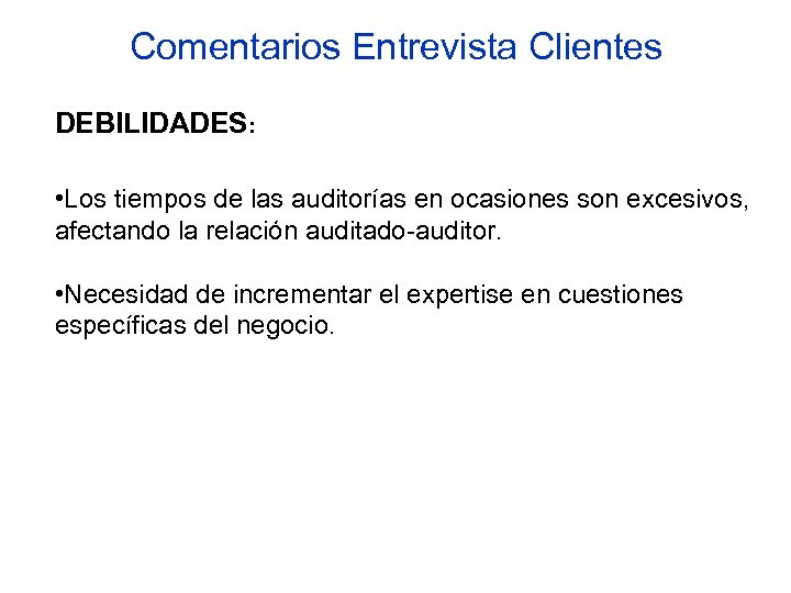 Comentarios Entrevista Clientes DEBILIDADES: • Los tiempos de las auditorías en ocasiones son excesivos, afectando la relación auditado-auditor. • Necesidad de incrementar el expertise en cuestiones específicas del negocio.
