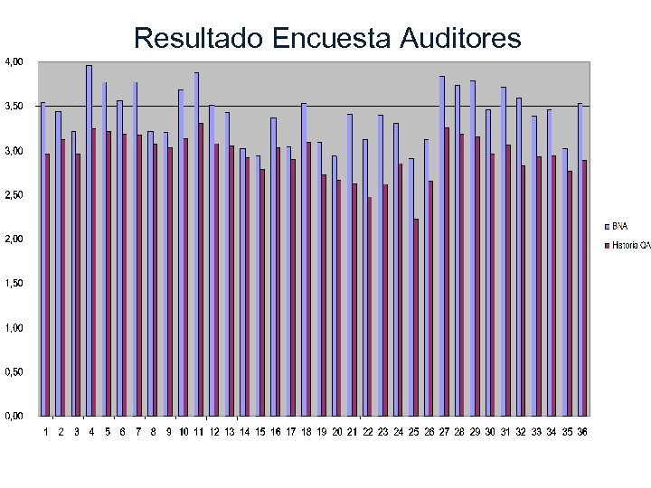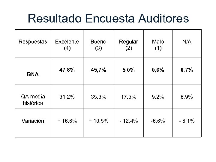 Resultado Encuesta Auditores Respuestas Excelente (4) Bueno (3) Regular (2) Malo (1) N/A 47, 8% 45, 7% 5, 0% 0, 6% 0, 7% QA media histórica 31, 2% 35, 3% 17, 5% 9, 2% 6, 9% Variación + 16, 6% + 10, 5% - 12, 4% -8, 6% - 6, 1% BNA