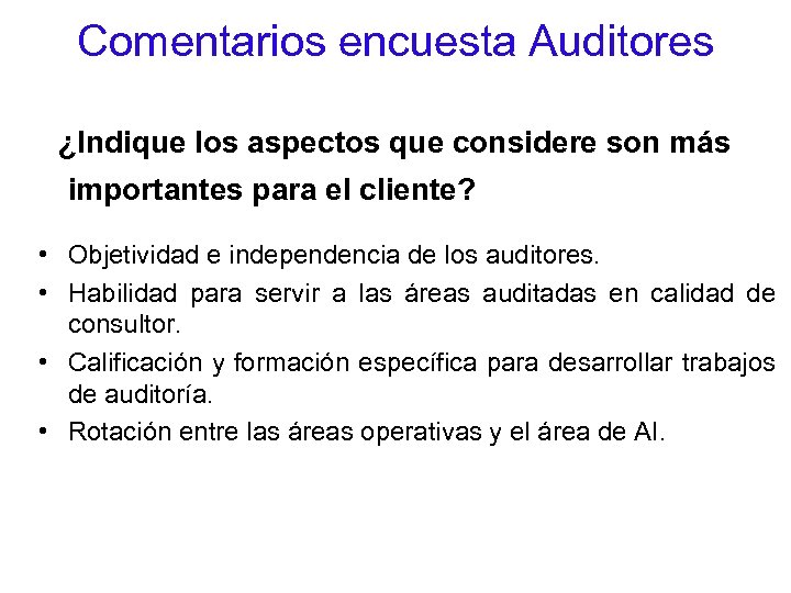 Comentarios encuesta Auditores ¿Indique los aspectos que considere son más importantes para el cliente? • Objetividad e independencia de los auditores. • Habilidad para servir a las áreas auditadas en calidad de consultor. • Calificación y formación específica para desarrollar trabajos de auditoría. • Rotación entre las áreas operativas y el área de AI.