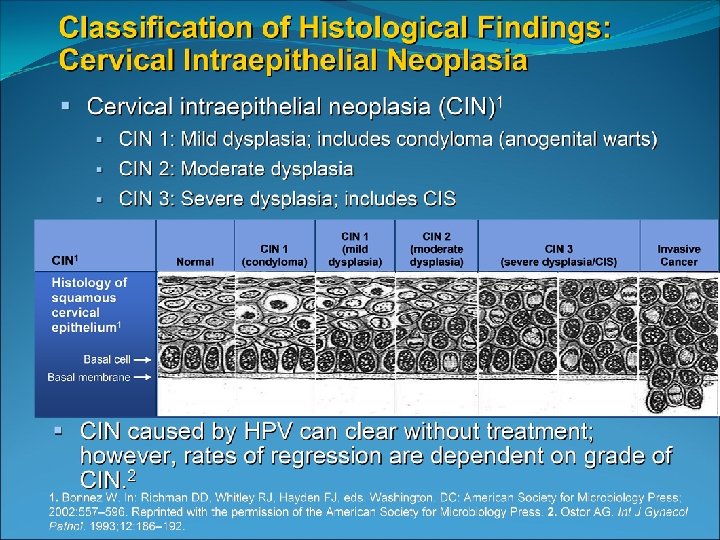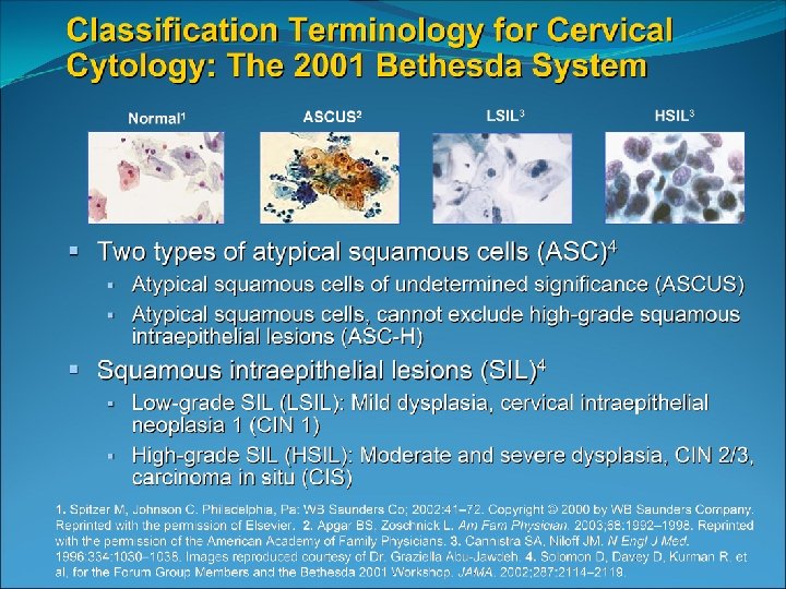 Bethesda System 2001 Epithelial Cell Abnormalities Squamous cell Atypical squamous cells (ASC) of undetermined significance (ASC-US) cannot exclude HSIL (ASC-H) Low-grade squamous intraepithelial lesion (LSIL) encompassing: human papillomavirus/mild dysplasia/cervical intraepithelial neoplasia (CIN) 1 High-grade squamous intraepithelial lesion (HSIL) moderate and severe dysplasia, carcinoma in situ; CIN 2 and CIN 3 Squamous cell carcinoma Glandular cell Atypical glandular cells (AGC) Atypical glandular cells, favor neoplastic Endocervical adenocarcinoma in situ (AIS) Adenocarcinoma