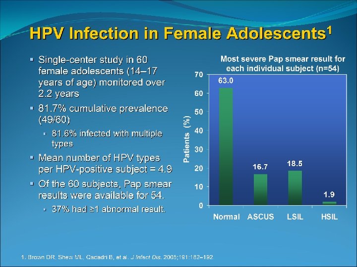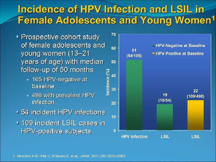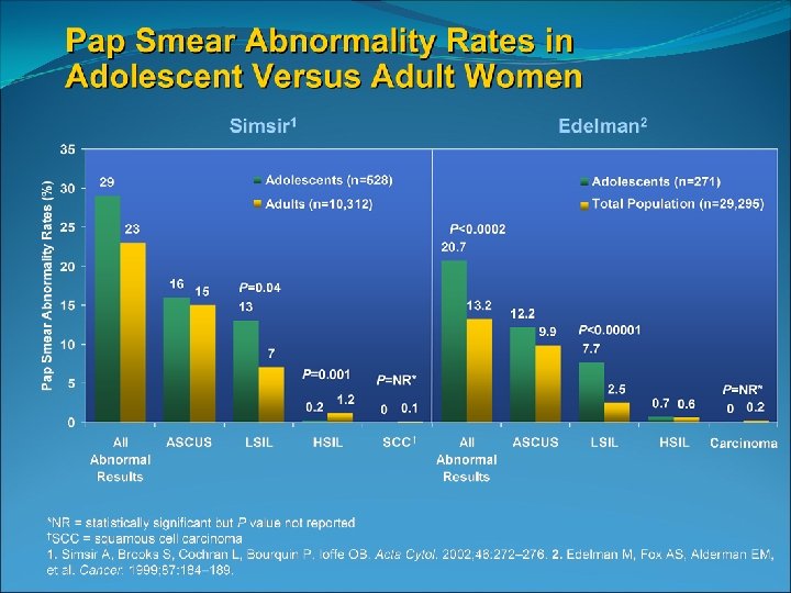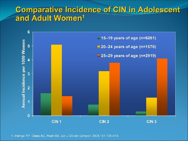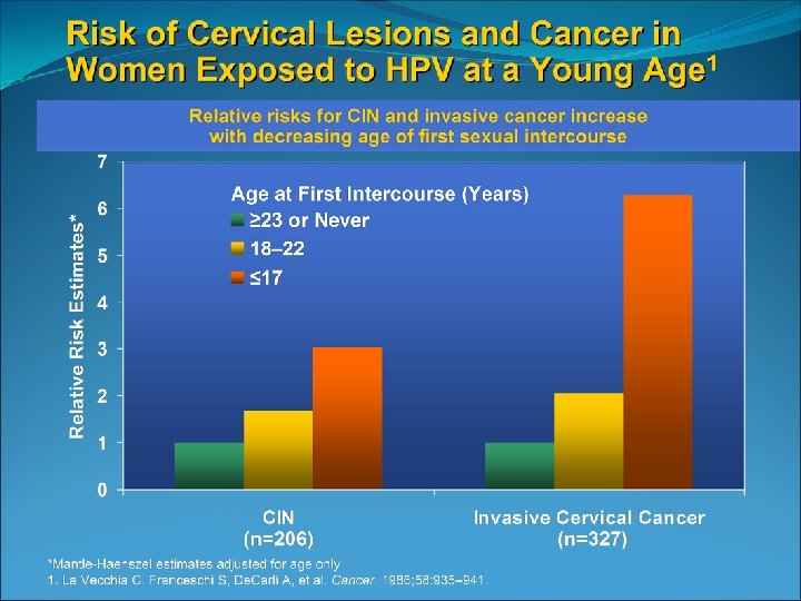 Invasive cervical cancer is rare in those younger than 21 Only 0. 1 % of cervical cancers occur before age 21 National data from 1998 through 2003 identified 14 cases of invasive cancer /year in those ages 15 -19 SEER 2002 -2006 incidence rate of 1 -2 cases per 1, 000 females aged 15 -19 (Surveillance Epidemiology and End Results)