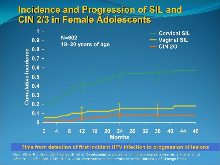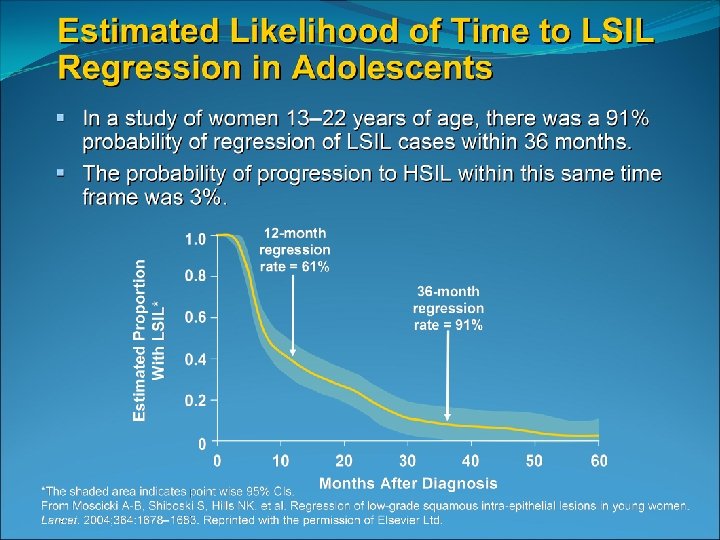 Most dysplasia regresses spontaneously in adolescents A prospective study of 187 women aged 18 -22 years old found that LSIL had reverted to negative in 61% after 1 year and 91% after 3 years Only 3% progressed to CIN 3 Two smaller studies of adolescent females with biopsy confirmed CIN 2 showed 65 -75% regression after 18 months and 36 months ACOG practice bulletin 2009