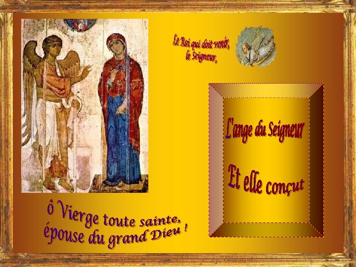 Gabriel, envoyé des cieux, fidèle messager de la parole, converse en un saint langage avec la Vierge bienheureuse. Sa parole bonne et suave se répand en la sainte demeure : et le nom d’Éva se change sur ses lèvres, il devient :