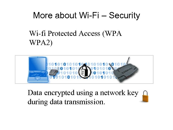 More about Wi-Fi – Security Wi-fi Protected Access (WPA 2) Data encrypted using a network key during data transmission.