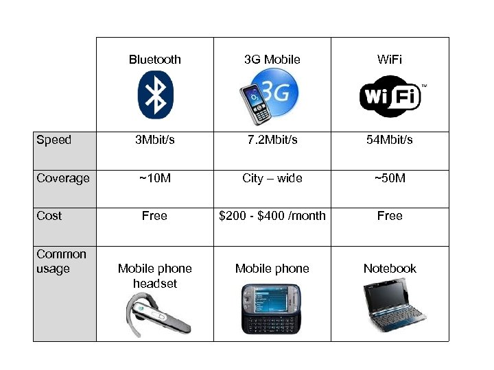 Bluetooth 3 G Mobile Wi. Fi 3 Mbit/s 7. 2 Mbit/s 54 Mbit/s Coverage ~10 M City – wide ~50 M Cost Free $200 - $400 /month Free Mobile phone headset Mobile phone Notebook Speed Common usage