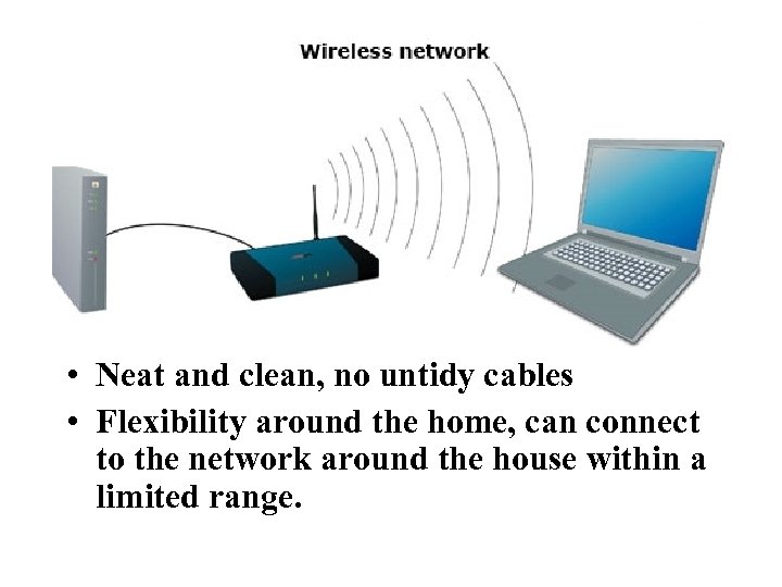 • Neat and clean, no untidy cables • Flexibility around the home, can connect to the network around the house within a limited range.