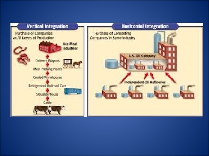 Horizontal Integration in Big Business • Bigger businesses buy out smaller businesses to create one large company • Ex: Rockefeller created Standard Oil by buying up all of the other oil refineries • Benefit-control prices and corner the market for big profits