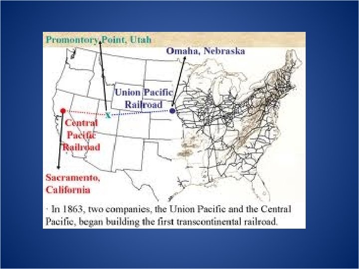 Transcontinental RR: Union Pacific RR • Started in Omaha, Ne • Problems: mountains, desert, lack of money, natives, worker differences • Workers- 10, 000 immigrants (Irish), miners, farmers, ex-cons