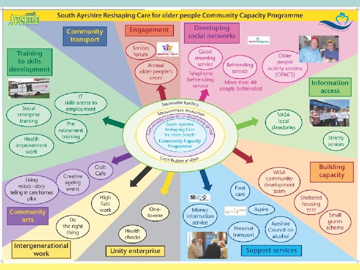 In Ayrshire partnerships the third and independent sectors have been viewed as essential partners in delivering our strategic plans (both in relation to Change Fund and the longer term Reshaping Care 10 year plans). In relation to the Community Capacity Building part of the planning the third sector interfaces have been vital players in relation to this. The next slide shows a summary of the Community Capacity programme within South Ayrshire illustrating the breadth and importance of this work strand as a discrete entity but also contributing to the other tiers of work.