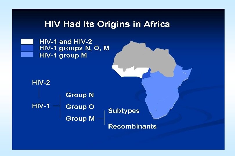 Types (Genotypes) of HIV Virus Types ( Ø HIV 1 Ø Ø Most common in sub-Saharan Africa and throughout the world Groups M (Main), N (New), and O (Outlayer) Ø Pandemic dominated by Group M Ø Group M comprised of subtypes A – K Ø Recombinant forms - AE, AG, AB, DF, BC, CD Ø As yet, different HIV-1 genotypes are not associated with different courses of disease nor response to antiviral therapy. Ø HIV 2 Most often found in West Central Africa, parts of Europe and India Ø