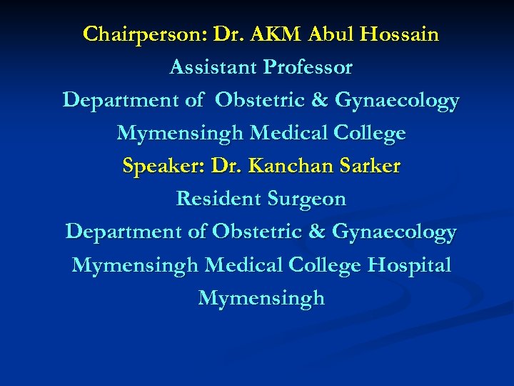 Chairperson: Dr. AKM Abul Hossain Assistant Professor Department of Obstetric & Gynaecology Mymensingh Medical College Speaker: Dr. Kanchan Sarker Resident Surgeon Department of Obstetric & Gynaecology Mymensingh Medical College Hospital Mymensingh