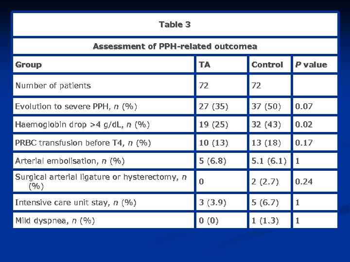 Table 3 Assessment of PPH-related outcomea Group TA Control P value Number of patients 72 72 Evolution to severe PPH, n (%) 27 (35) 37 (50) 0. 07 Haemoglobin drop >4 g/d. L, n (%) 19 (25) 32 (43) 0. 02 PRBC transfusion before T 4, n (%) 10 (13) 13 (18) 0. 17 Arterial embolisation, n (%) 5 (6. 8) 5. 1 (6. 1) 1 Surgical arterial ligature or hysterectomy, n (%) 0 2 (2. 7) 0. 24 Intensive care unit stay, n (%) 3 (3. 9) 5 (6. 7) 1 Mild dyspnea, n (%) 0 (0) 1 (1. 3) 1