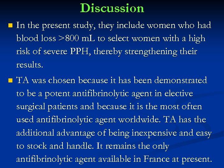 Discussion n In the present study, they include women who had blood loss >800 m. L to select women with a high risk of severe PPH, thereby strengthening their results. n TA was chosen because it has been demonstrated to be a potent antifibrinolytic agent in elective surgical patients and because it is the most often used antifibrinolytic agent worldwide. TA has the additional advantage of being inexpensive and easy to stock and handle. It remains the only antifibrinolytic agent available in France at present.