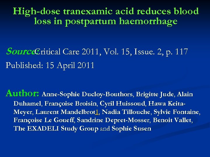 High-dose tranexamic acid reduces blood loss in postpartum haemorrhage Source: Critical Care 2011, Vol. 15, Issue. 2, p. 117 Published: 15 April 2011 Author: Anne-Sophie Ducloy-Bouthors, Brigitte Jude, Alain Duhamel, Françoise Broisin, Cyril Huissoud, Hawa Keita. Meyer, Laurent Mandelbrot 1, Nadia Tillouche, Sylvie Fontaine, Françoise Le Goueff, Sandrine Depret-Mosser, Benoit Vallet, The EXADELI Study Group and Sophie Susen
