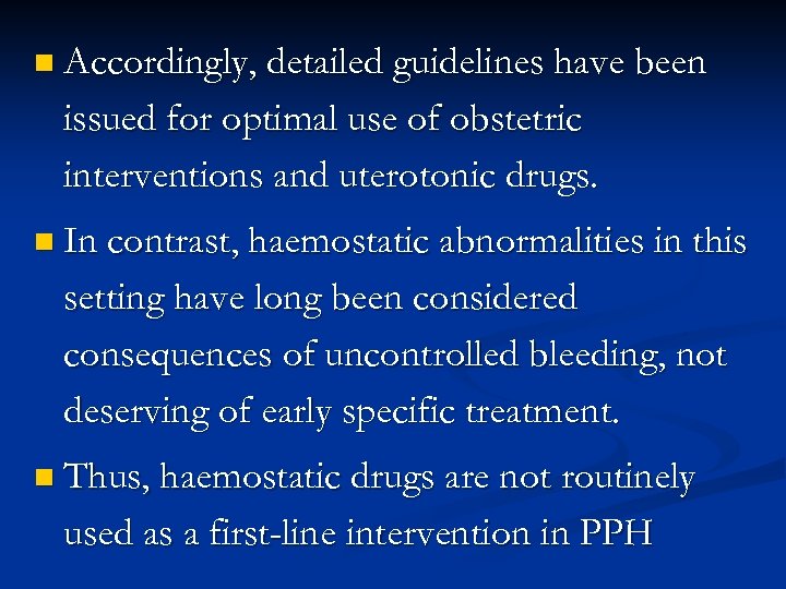 n Accordingly, detailed guidelines have been issued for optimal use of obstetric interventions and uterotonic drugs. n In contrast, haemostatic abnormalities in this setting have long been considered consequences of uncontrolled bleeding, not deserving of early specific treatment. n Thus, haemostatic drugs are not routinely used as a first-line intervention in PPH