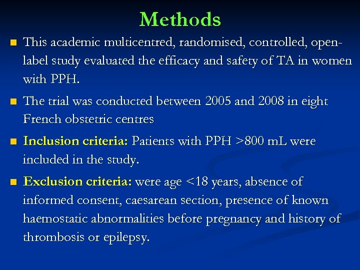 Methods n This academic multicentred, randomised, controlled, openlabel study evaluated the efficacy and safety of TA in women with PPH. n The trial was conducted between 2005 and 2008 in eight French obstetric centres n Inclusion criteria: Patients with PPH >800 m. L were included in the study. n Exclusion criteria: were age <18 years, absence of informed consent, caesarean section, presence of known haemostatic abnormalities before pregnancy and history of thrombosis or epilepsy.