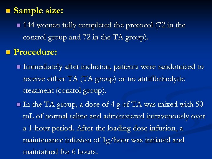 n Sample size: n n 144 women fully completed the protocol (72 in the control group and 72 in the TA group). Procedure: n Immediately after inclusion, patients were randomised to receive either TA (TA group) or no antifibrinolytic treatment (control group). n In the TA group, a dose of 4 g of TA was mixed with 50 m. L of normal saline and administered intravenously over a 1 -hour period. After the loading dose infusion, a maintenance infusion of 1 g/hour was initiated and maintained for 6 hours.