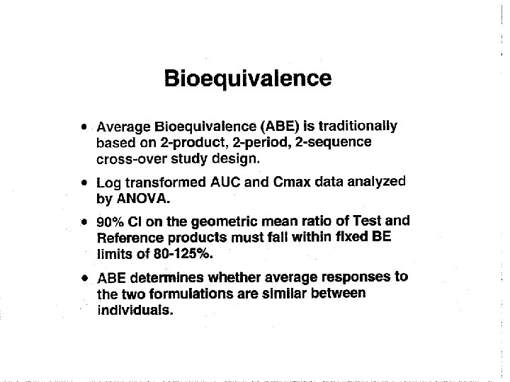 NTI Drugs • BE Studies: Two treatment, four period replicated crossover design to quantify the variability of both T and R products and use reference scaled average BE approach for determination of BE. • The BE limits would change as a function of within subject variability of the reference product. FDA proposes for NTI drugs that the default BE limits be 90 -111% and that they be scaled using a regulatory constant of sigma 0 = 0. 1 (which corresponds to a CV of 10. 03%). • Point estimate limits for Cmax and AUC and a requirement that 90% CI of T/R Cmax and AUC ratios include 100%. • Ref: Draft Guidance - Warfarin
