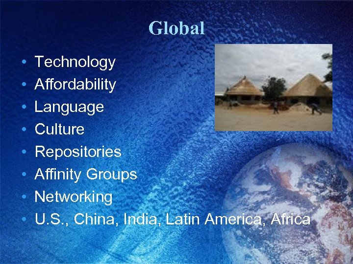 Global • • Technology Affordability Language Culture Repositories Affinity Groups Networking U. S. , China, India, Latin America, Africa