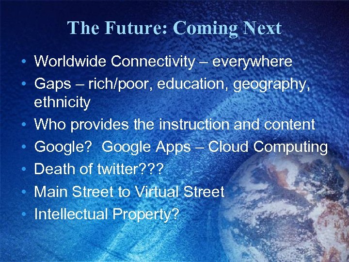 The Future: Coming Next • Worldwide Connectivity – everywhere • Gaps – rich/poor, education, geography, ethnicity • Who provides the instruction and content • Google? Google Apps – Cloud Computing • Death of twitter? ? ? • Main Street to Virtual Street • Intellectual Property?