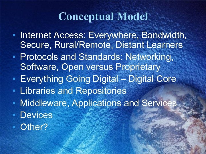 Conceptual Model • Internet Access: Everywhere, Bandwidth, Secure, Rural/Remote, Distant Learners • Protocols and Standards: Networking, Software, Open versus Proprietary • Everything Going Digital – Digital Core • Libraries and Repositories • Middleware, Applications and Services • Devices • Other?