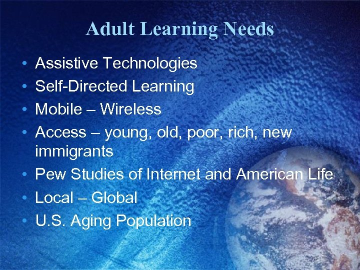 Adult Learning Needs • • Assistive Technologies Self-Directed Learning Mobile – Wireless Access – young, old, poor, rich, new immigrants • Pew Studies of Internet and American Life • Local – Global • U. S. Aging Population