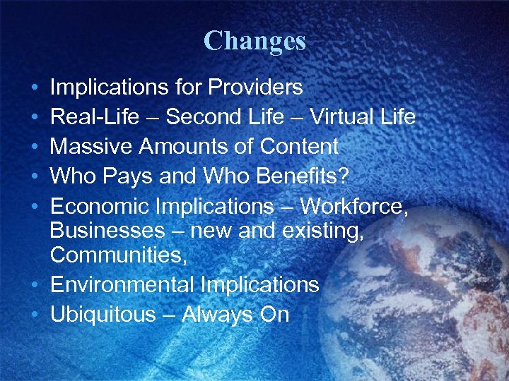 Changes • • • Implications for Providers Real-Life – Second Life – Virtual Life Massive Amounts of Content Who Pays and Who Benefits? Economic Implications – Workforce, Businesses – new and existing, Communities, • Environmental Implications • Ubiquitous – Always On