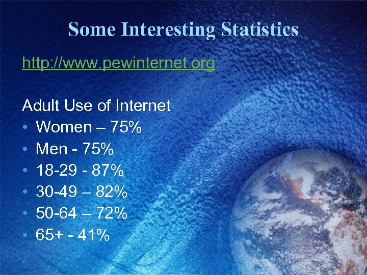 Some Interesting Statistics http: //www. pewinternet. org Adult Use of Internet • Women – 75% • Men - 75% • 18 -29 - 87% • 30 -49 – 82% • 50 -64 – 72% • 65+ - 41%